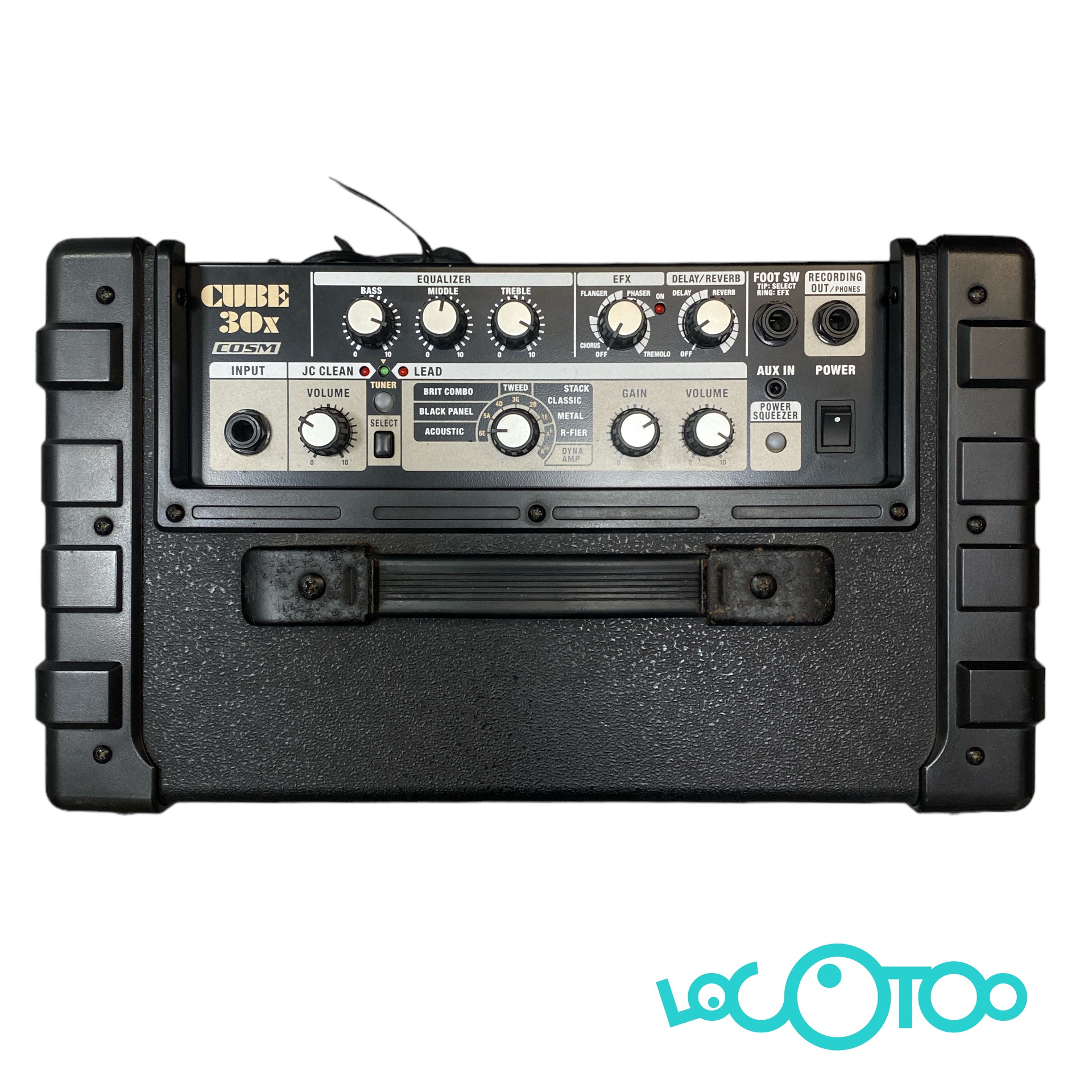 - Controles: Interruptor, Interruptor selector, afinador Switch, interruptor SQUEEZER, botón de volumen, tipo conmutador (PANEL acústico, negro, BRIT COMBO, TWEED, clásico pila, METAL pila, pila R-FIER, DYNA AMP), pomo del ganancia, botón de volumen, bajo mando, mando medio, agudos del pomo, botón EFX (CHORUS, FLANGER, PHASER, TRÉMOLO), pomo de Delay/REVERBERACIÓN