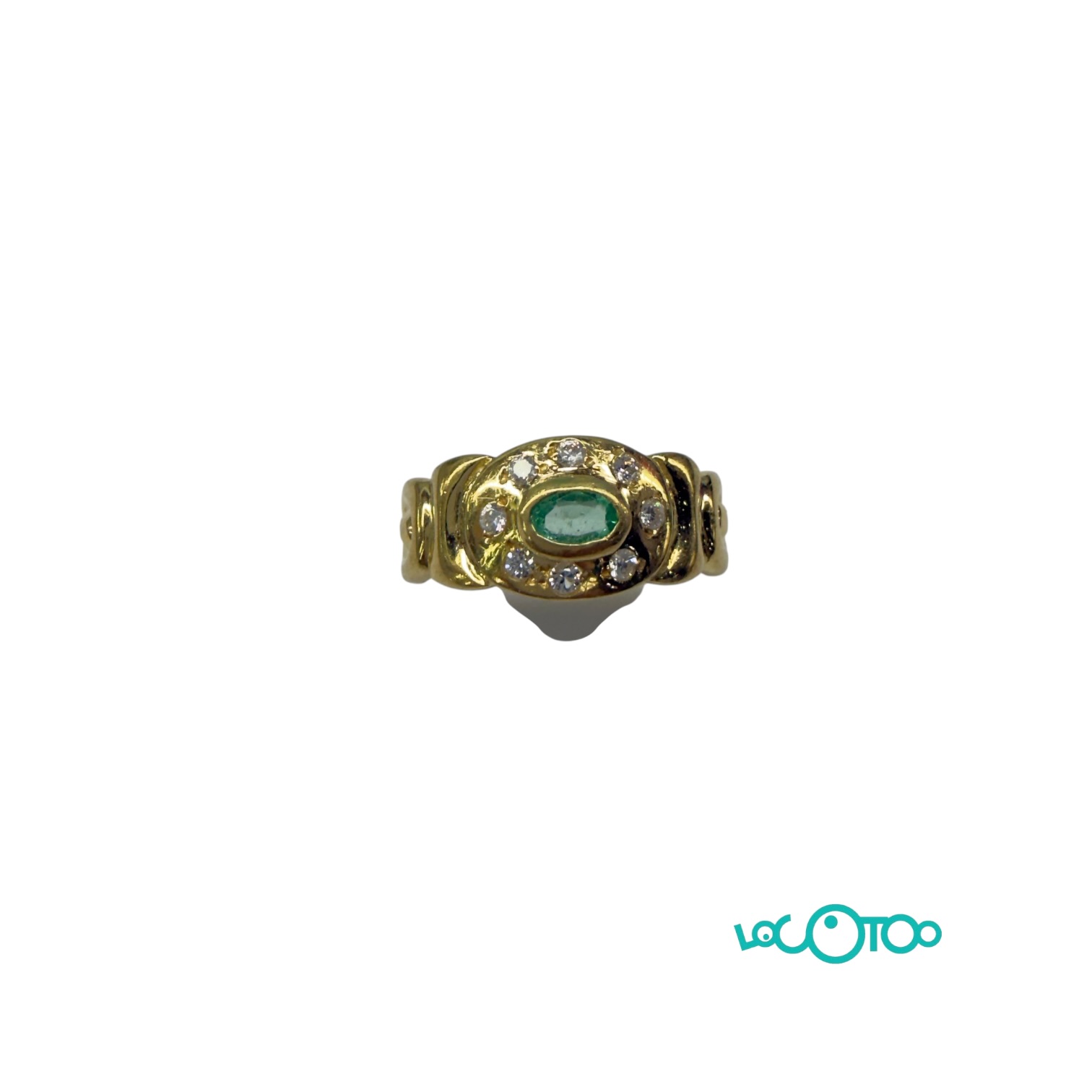 Anillo oro 18 k , esmeralda oval de 2,7x 4,2mm, orla alrededor de circonitas , ancho de la cima 9,7 mm . Talla 19 . Peso 3,80 grs