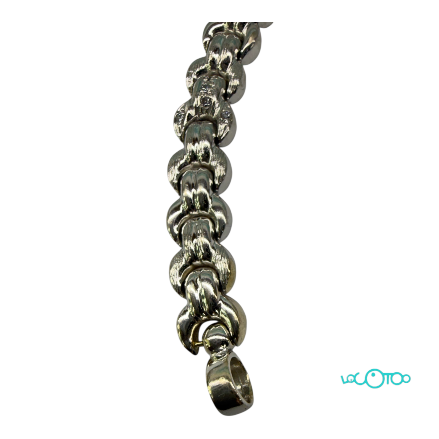 Pulsera Oro blanco 18K, diamantes peso total aprox 0,35ct, malla hueca de 8 mm ancho y 4,2 mm de grosor , cierre de mosquetón de 18 mm de diámetro y 3.5 mm grosor . Largo pulsera 19,5 cms y peso 21,30 grs.Falta baño de rodio en zonas de roce .